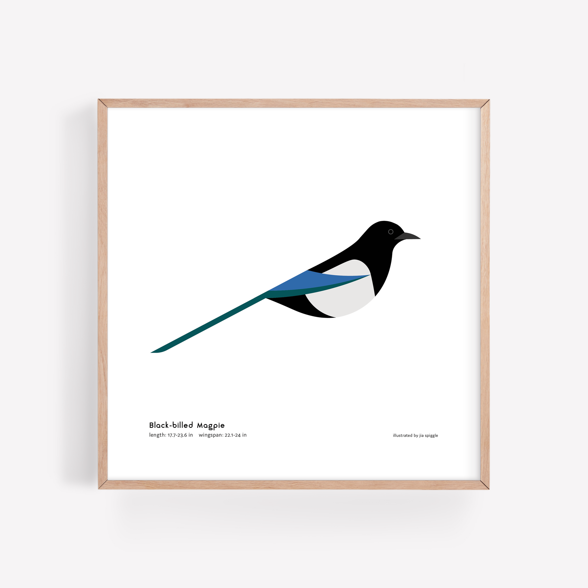 This is an illustrated 8x8" print of the Black-billed Magpie and includes the common name, length, and wingspan. It is a field guide and art print all in one!