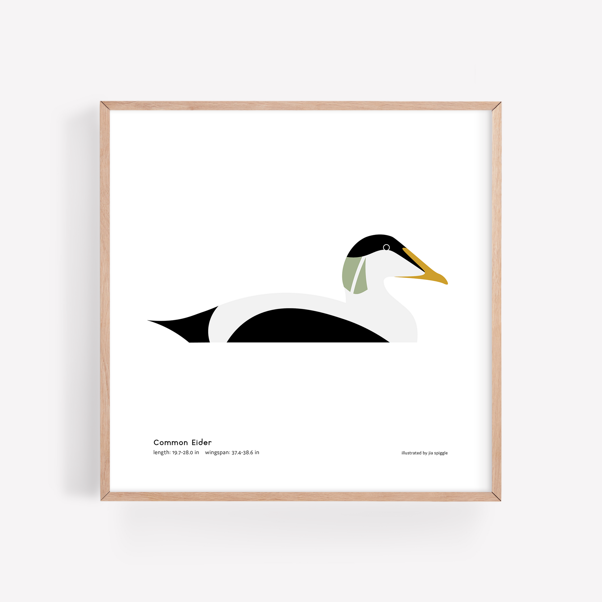 This is an illustrated 8x8" print of the Common Eider and includes the common name, length, and wingspan. It is a field guide and art print all in one!