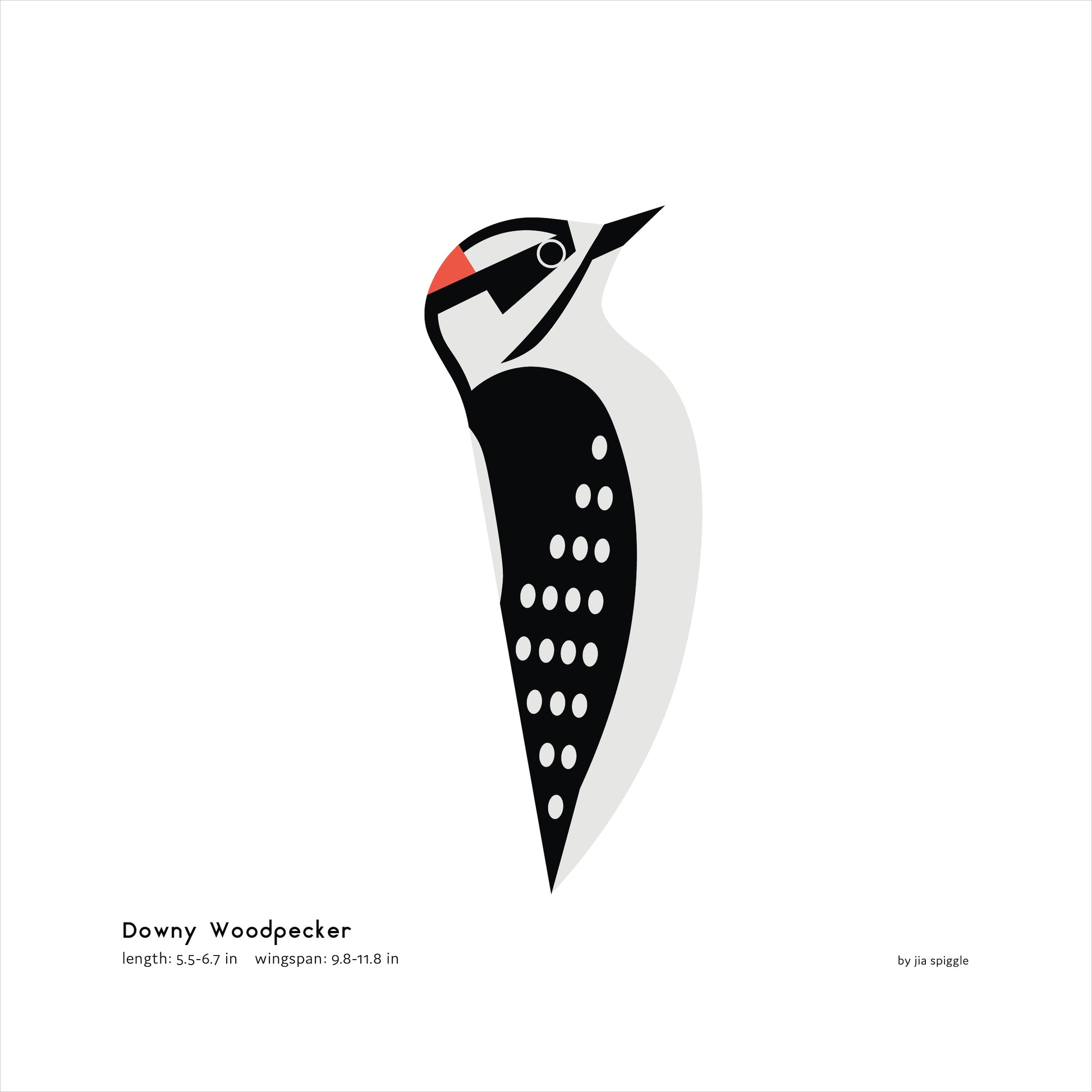This 8×8" illustrated giclée print features the Downy Woodpecker, complete with its common name, length, and wingspan—making it both a field guide and art print.