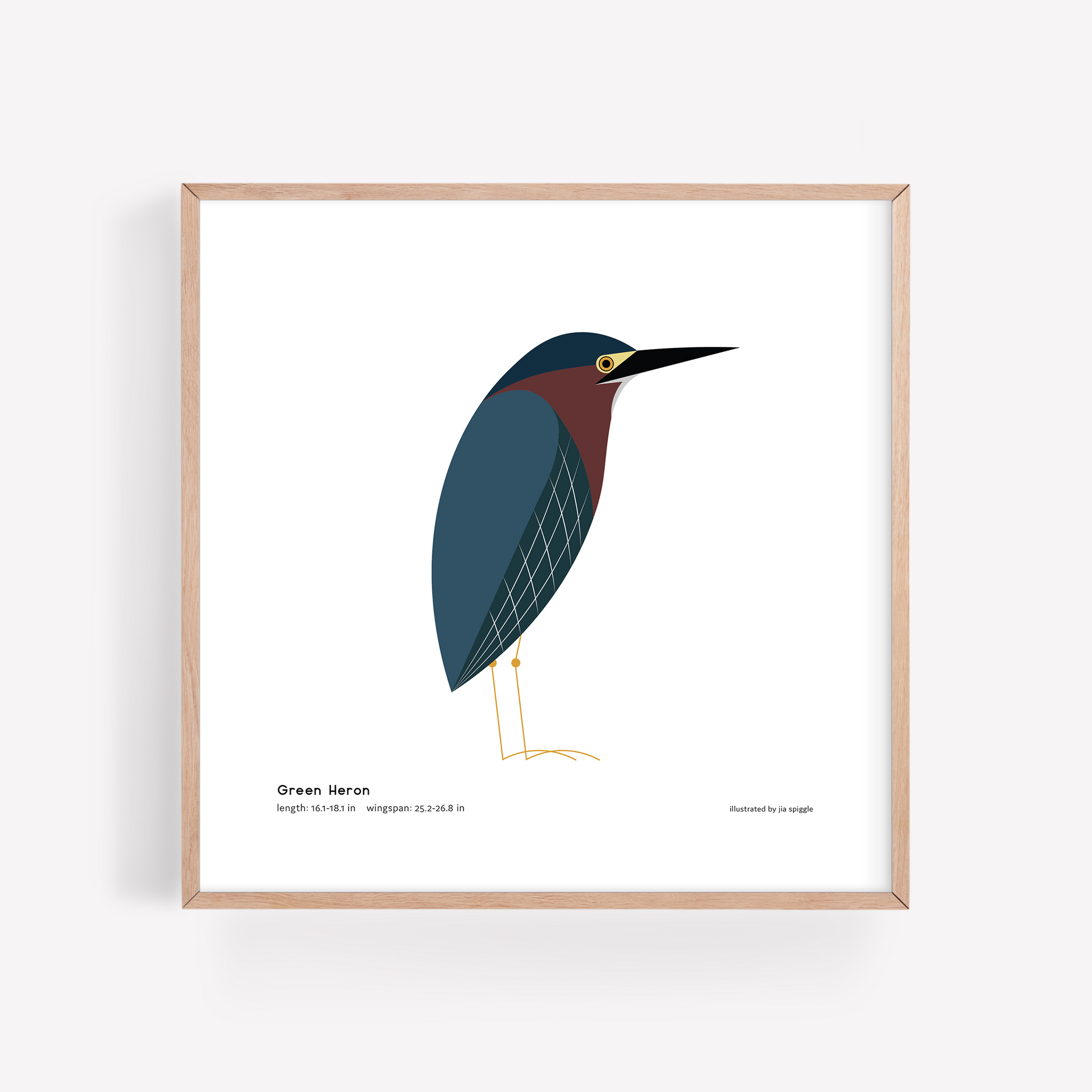 This is an illustrated 8x8" print of the Green Heron and includes the common name, length, and wingspan. It is a field guide and art print all in one!