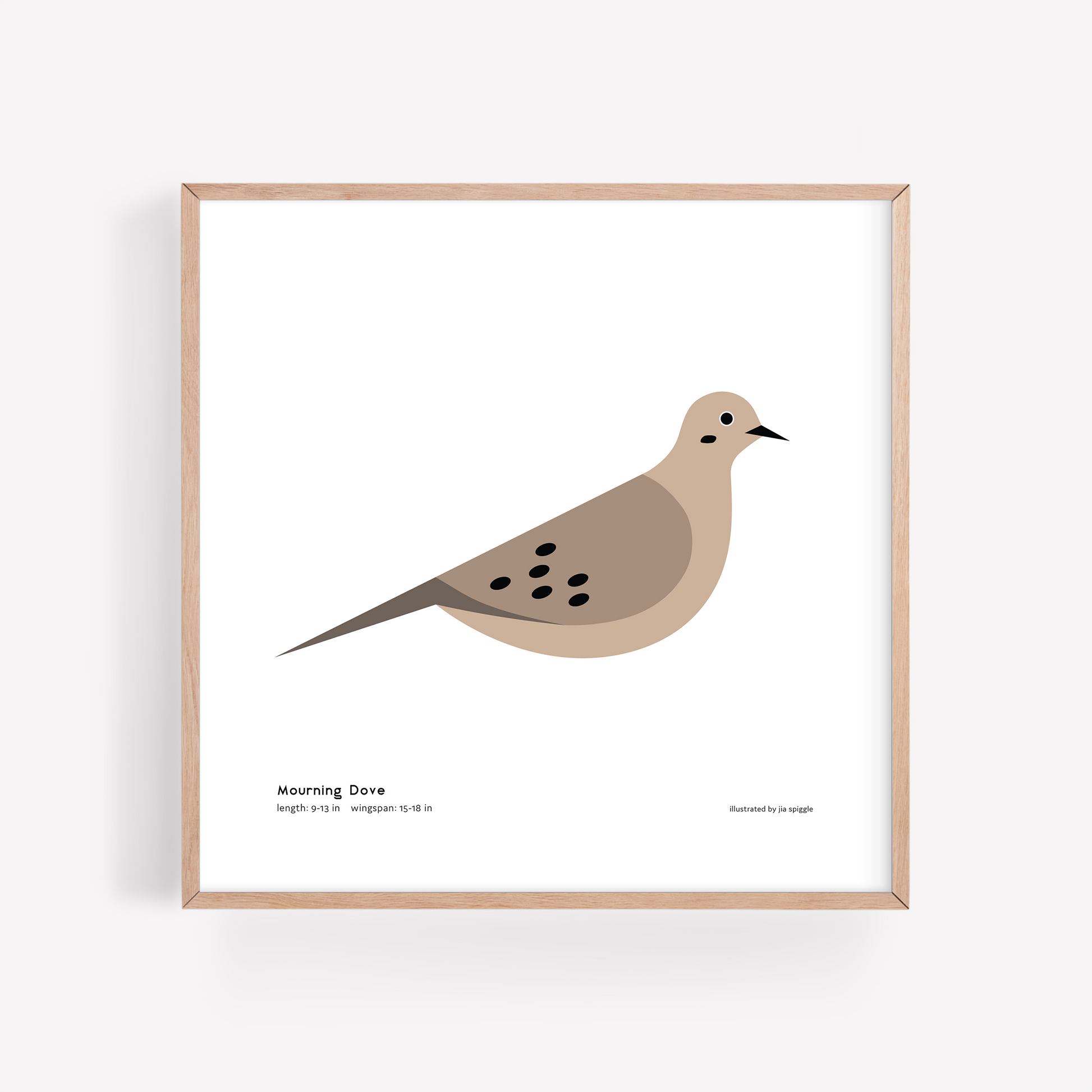 This is an illustrated 8x8" print of the Mourning Dove and includes the common name, length, and wingspan. It is a field guide and art print all in one!