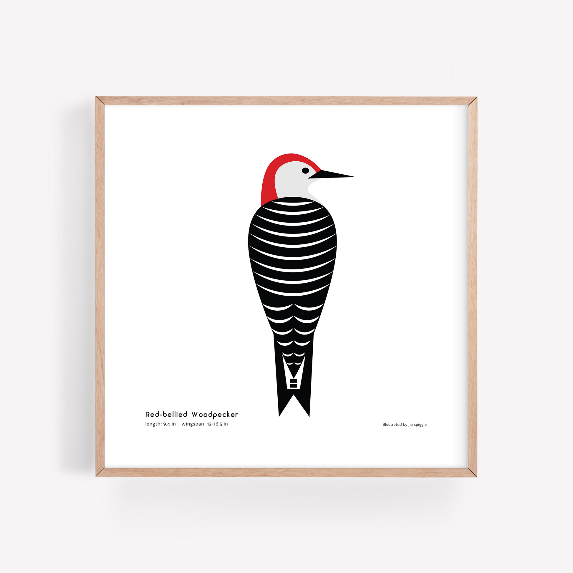 This is an illustrated 8x8" print of the Red-bellied Woodpecker and includes the common name, length, and wingspan. It is a field guide and art print all in one!